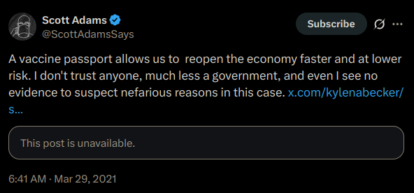- Scott Adams on Gab - he used to post here before he switched to X-Twitter to grift people into being "subscribers" like a tween bot-count-pumped "influencer". His audience was here and TruthSocial, but he wanted to be on X-Twitter to curry favor with Elon Musk and wanted his musings to go "viral" and get millions of views/retweets